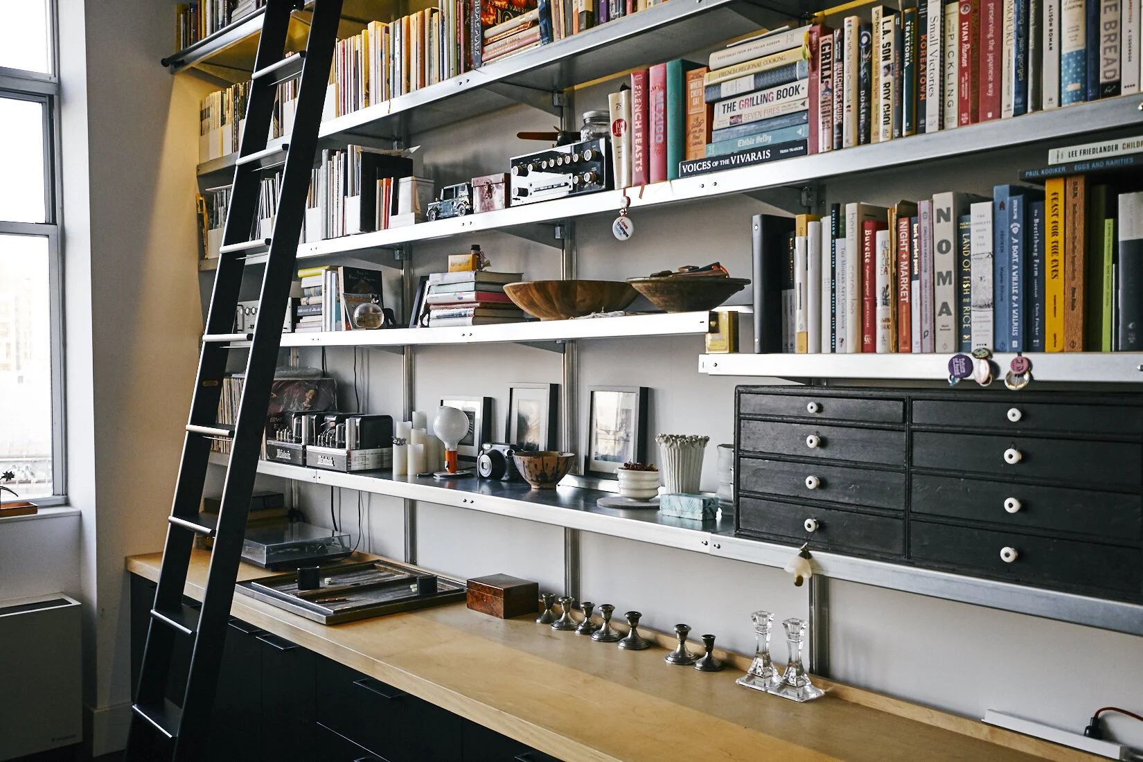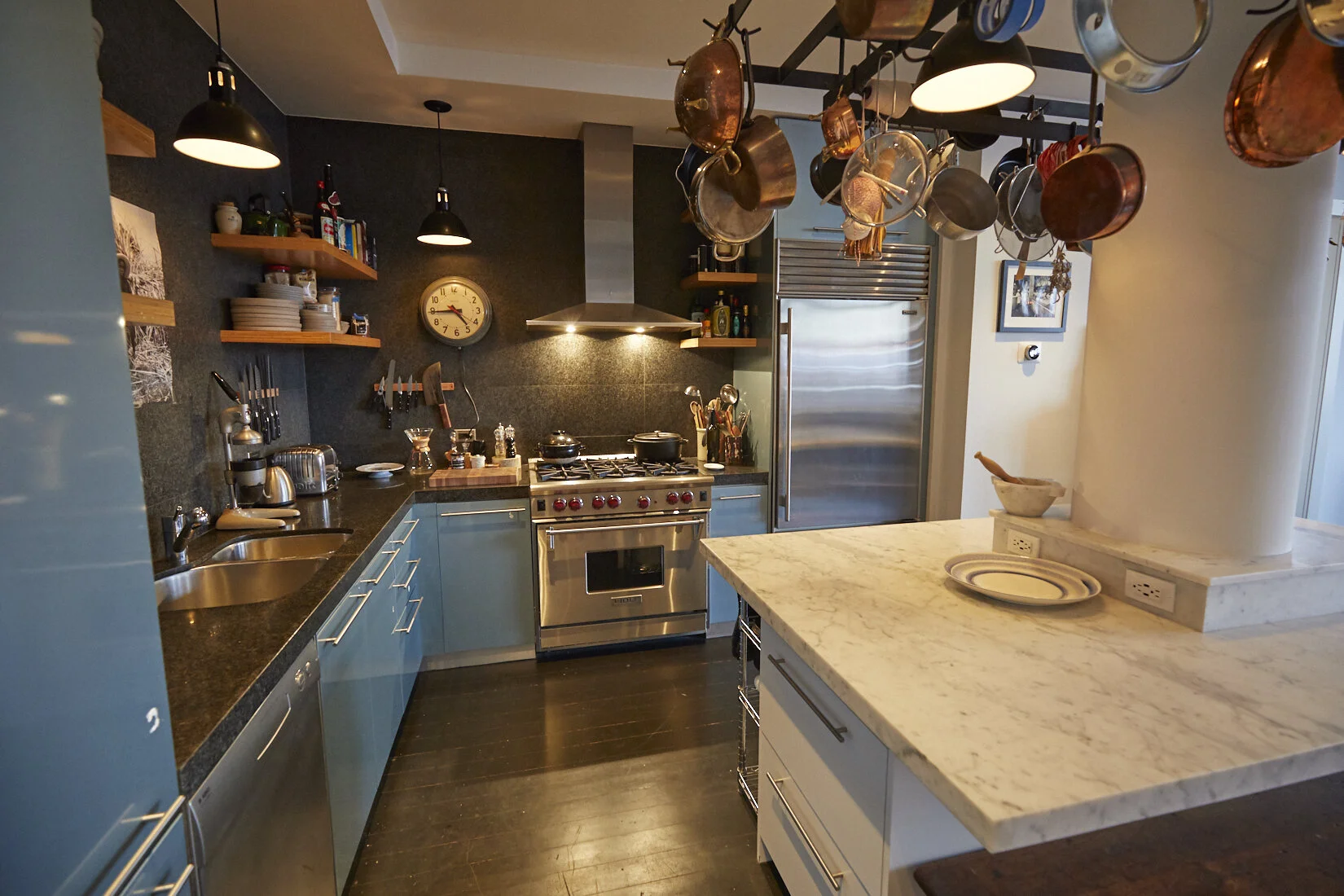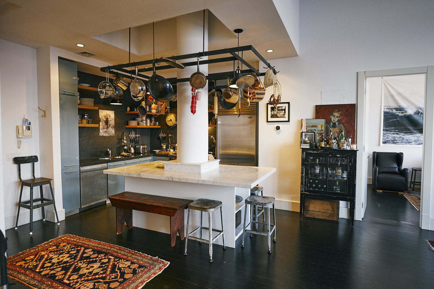 This two bedroom apartment was converted into a one bedroom loft-like space with an oversized island in the kitchen and a wall of industrial-type storage in the living room. A large space with a fantastic view was thus created for cooking together and entertaining.